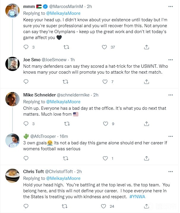 值得一提的是,梅凯拉-摩尔还是利物浦女足队中的一员,在经历了这样一场失败的比赛之后,也有不少球迷来到她的社交媒体账号下为她送上安慰和鼓励。