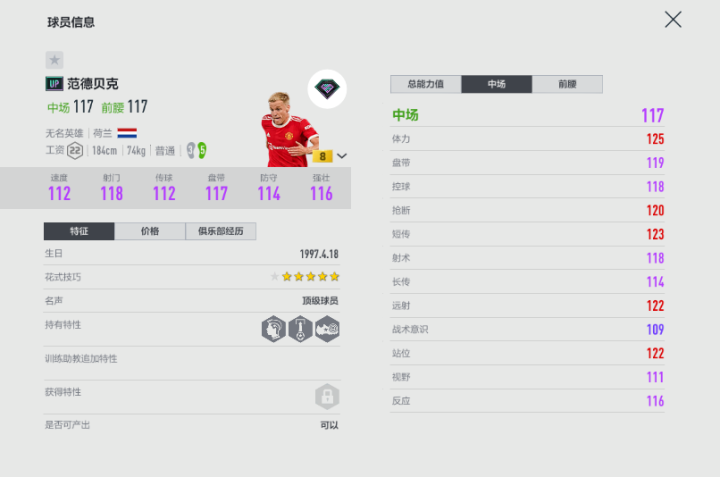 游戏中的UP范德贝克是一张非常惊艳的卡,进攻和防守属性相当全面,远射、站位、短传、抢断等属性能够突破130大关,而且,他的体重74kg对于中场球员来说属于较轻水准,在实战中对于他带球后的转身、盘带突破手感都有着很大的帮助。我曾经组过现役红魔队套,范德贝克在球队中起到了承上启下的作用,是不可或缺的B2B超级中场,进球效率排在全队第3,无论是远射能力还是防守时回追拦截的奔跑速率,都在游戏里体现的淋漓尽致。目前,这张金卡的价格在6兆左右,虽然过了最低点的4兆,不过还是属于可接受的首发级别球员范围内。