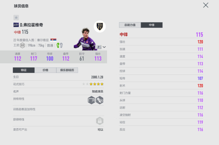 在游戏中,最新推出的22TY赛季弗拉霍维奇是唯一拥有不错数据的卡,从属性来看,他的技术特点很全面,像盘带、平衡等手感相关属性也超过了120,不过由于只有四星花式,还是不介意用他过多带球,毕竟双速也不算很快。当然,在拥有双灯的情况下,他的跑位效率还是很高的,而且有快速带球特性,再加上75kg的轻体重,来回于反越位的转身速率是不慢的,也比较符合当前直塞为主流打法的游戏。当然,53脚对于他的右脚射门来说是一大隐患,玩家需要尽可能调整到左脚完成搓射或者低射的处理。