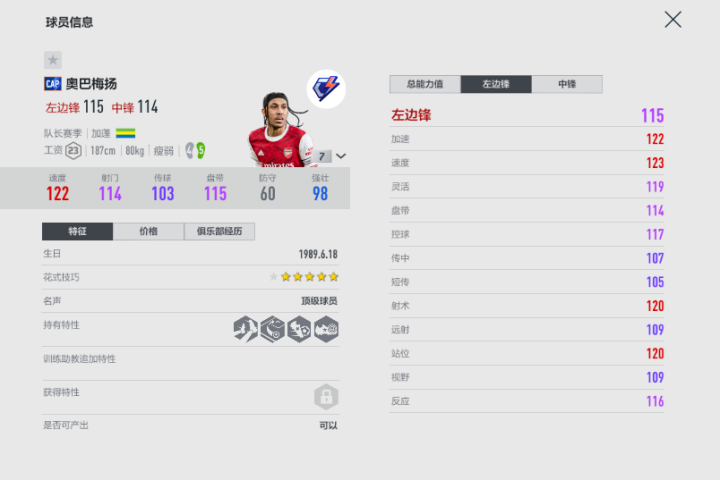 游戏中的CAP赛季奥巴梅扬是他当之无愧的巅峰赛季卡,7卡的双速即可突破130,初始位置是边锋的他有着187的大模型,这也意味着在护球以及身体对抗上,奥巴梅扬比起一般边锋能够有优势,迈着大长腿奔跑的他很适合反击战,一旦速度起来,凭借步伐以及快速带球特性,防守球员是很难追上的。当然,他的传中和体力属性在边锋范围中只能算是一般,更多是依靠身位上的优势获得单刀机会,如果有擅于搓射特性,他的终结能力会更上一层楼。