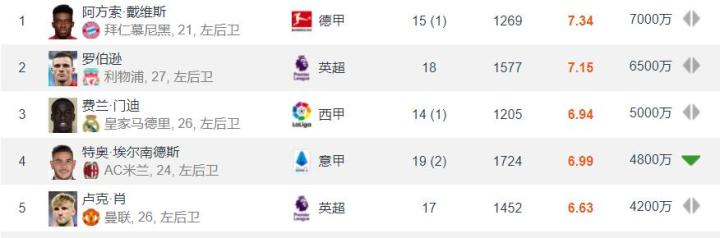 在左后卫位置身价排行榜上,排名第一的是来自于加拿大的小将阿方索戴维斯。