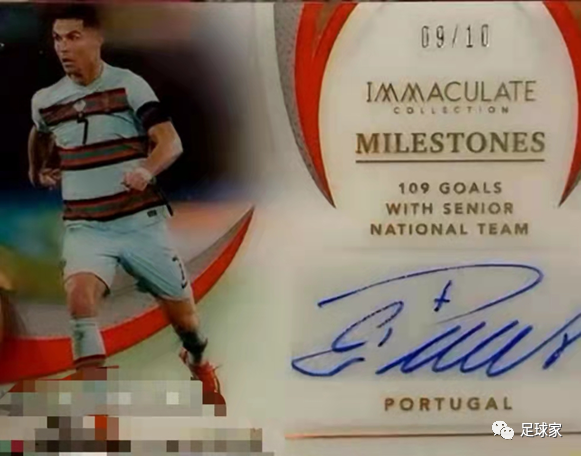 Milestones(里程碑签字)是颇具收藏价值的一款签字,它和刚刚所说的时刻签字有些相似,这是一款纪念球员职业生涯的一个成就的签字。图中是最近拆出的C罗里程碑签字,卡片上写着“109 Goals with senior national team”,这是纪念C罗追平了阿里·代伊的109球国家队进球记录并肩国家队射手王这一里程碑事件