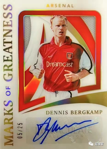 Marks of Greatness(伟大标志签字)的设计我个人是非常喜欢的,球员名单也是非常豪华,一共10人的球员名单几乎是个个好人。图中是”冰王子“博格坎普的伟大标志签字,选图非常帅气。球员名单如下:米亚·哈姆(美国,25编或更低)、马拉多纳(阿根廷,25编或更低)、C罗(葡萄牙,10编或更低)、梅西(巴黎圣日耳曼,25编或更低)、诺伊尔(拜仁,25编或更低)、博格坎普(阿森纳,25编或更低)、鲁尼(曼联,5编或更低)、兰帕德(切尔西,25编或更低)、贝克汉姆(曼联,5编或更低)、阿兰·席勒(纽卡斯尔,25编或更低)。