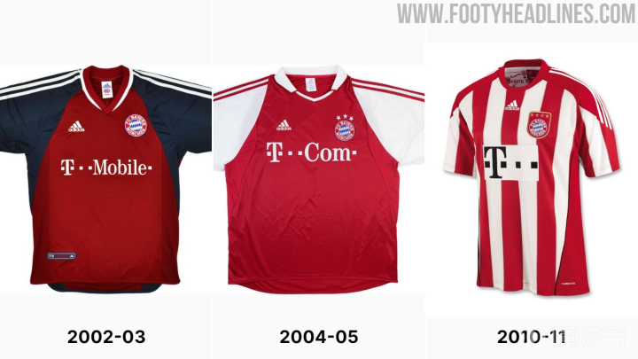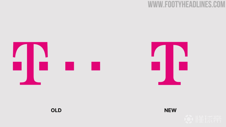 众所周知拜仁胸前广告长期是TELEKOM(德国电信公司),近日该公司更改了他们的公司标志,主要变化是删除了两个右方格,对“T”的几何形状仅限了一些调整。更新后的外观更对称、更现代化。自2002年以来,拜仁一直是使用德国电信作为胸前广告,到目前为止,该标志一个改变了三次,由于22-23赛季的拜仁球衣已经曝光(图三为22-23球衣),胸前广告不变,所以改版后的胸前广告最快于23-24赛季出现在拜仁球衣上。你认为改版后的广告搭配球衣是否更协调了呢?