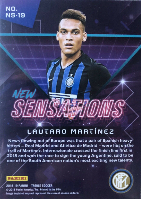 这款是18-19赛季高音系列150编的新感觉特卡,卡牌背面提到2018年夏天国米击败马德里双雄,签下了当时还未满21岁的劳塔罗-马丁内斯,他也被视为南美最有天赋的年轻射手。
