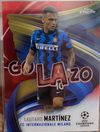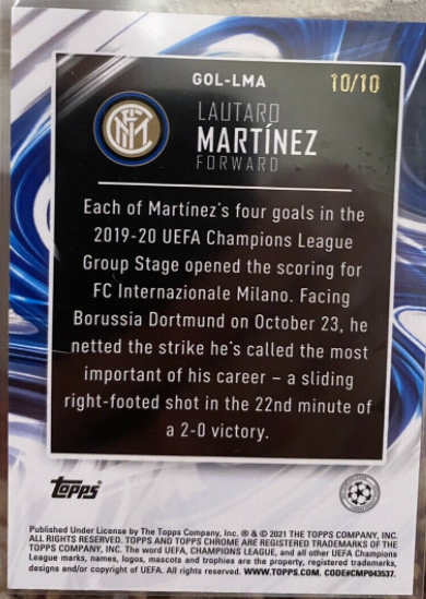 这款是20-21赛季Topps Chrome欧冠系列10编尾编的精彩进球(Golazo,西班牙语欢呼进球和胜利的意思)红平行,卡牌背面提到劳塔罗在19-20赛季欧冠小组赛中总共4次为国米首开纪录,其中2019年10月28日主场对阵多特蒙德,比赛第22分钟他为球队打破僵局,最终蓝黑军团2-0击退大黄蜂。