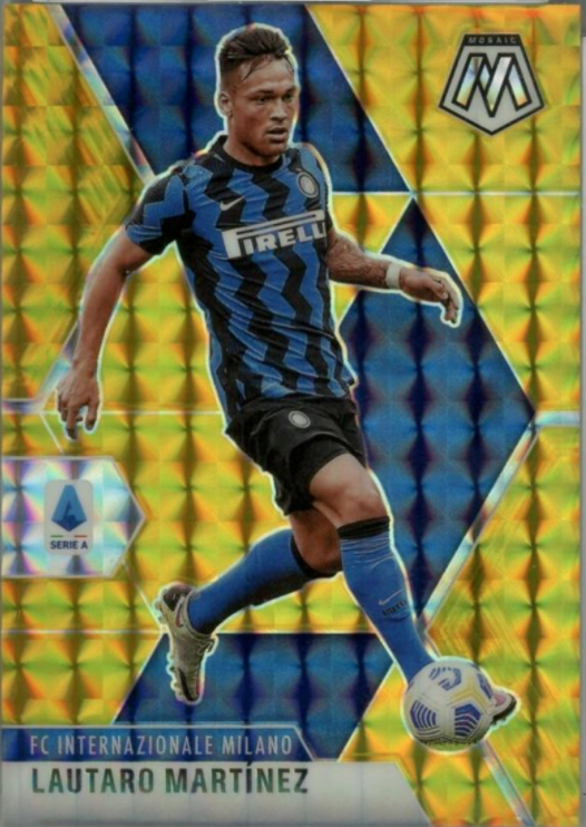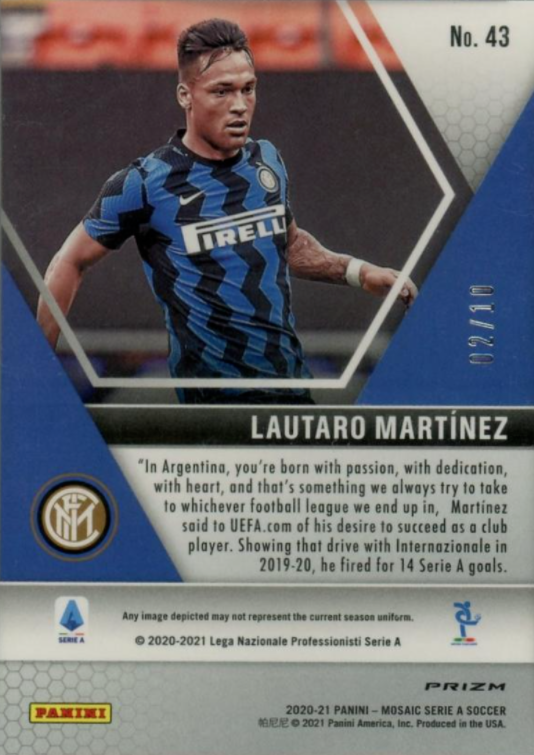 这款是20-21赛季马赛克系列10编的金马赛克平行,卡牌背面提到19-20赛季意甲联赛,劳塔罗-马丁内斯总共为国米打入14球。