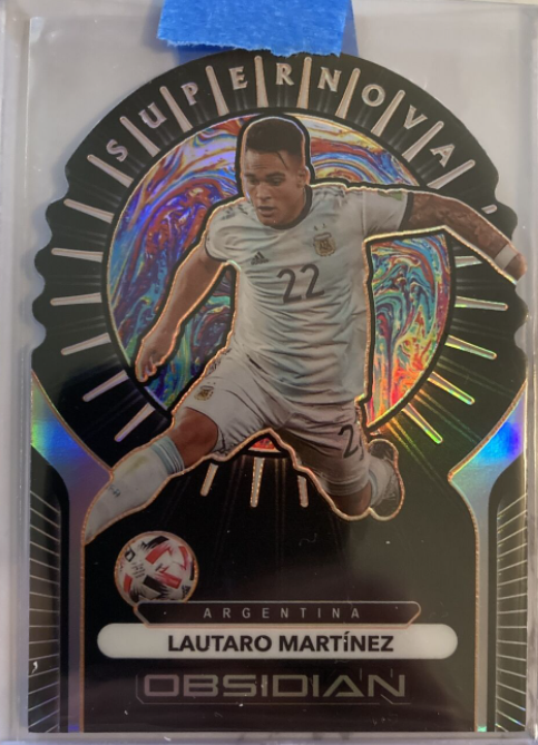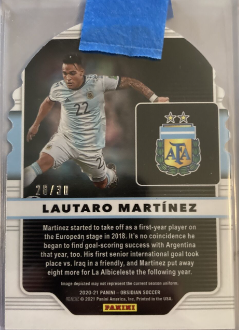 这款是20-21赛季黑曜石系列的30编超新星橙电蚀刻平行,卡牌背面提到劳塔罗-马丁内斯首次登上欧战舞台和为阿根廷国家队效力都发生在2018年,他的国家队首球是在对阵伊拉克的热身赛中取得的。