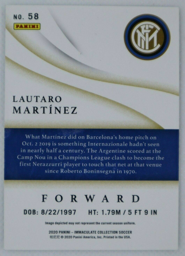 这款是2020IMM系列99编的Base,卡牌背面提到2019年10月2日,在欧冠小组赛国米作客巴萨的比赛中,劳塔罗打入一球,成为了1970年罗伯托-博宁塞尼亚后首位在诺坎普取得进球的国米球员。