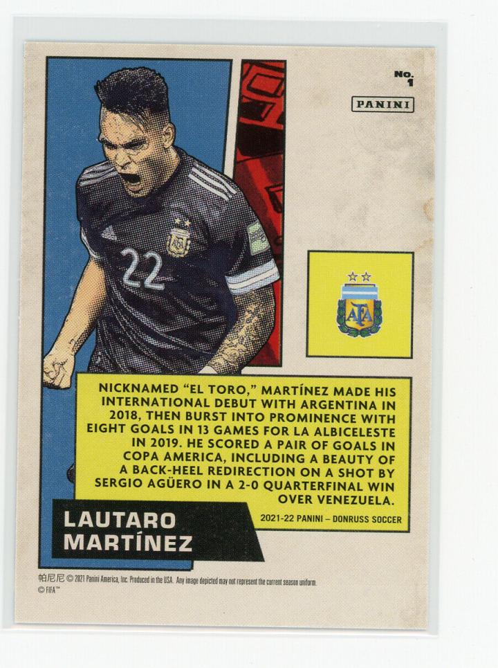这款是21-22赛季Donruss通往卡塔尔之路系列的网络奇迹特卡,卡牌背面提到劳塔罗-马丁内斯2018年上演了阿根廷国家队首秀,2019年他在国家队13场比赛中打入8球,其中美洲杯1/4决赛对阵委内瑞拉,劳塔罗为阿根廷首开纪录,最终阿根廷2-0赢球晋级。