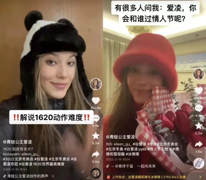 再比如谷爱凌的自拍「时装秀」,在抖音获得100多万点赞,夺金后的4条抖音总互动量超千万。而无论是秀金牌吃包子、与冰墩墩过情人节还是解说1620动作难度、跳舞庆祝收获银牌却不小心打到吊灯,都是运动员自我展示、与大众互动的全新方式。
