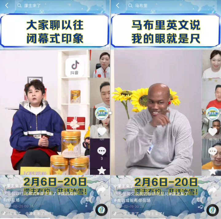 实际上,「濛主来了」是一个更为多元化的直播间,这里不仅有运动员、视频创作者、体育KOL还有明星艺人。比如马布里用英文翻译「我的眼睛就是尺」、惠若琪感同身受徐梦桃、达人伊博一口东北味英语、魏翔现场表现电影名场面……当这些关于体育、生活以及艺术的元素汇集于此,也带动着大众感受更多元化的冰雪文化。