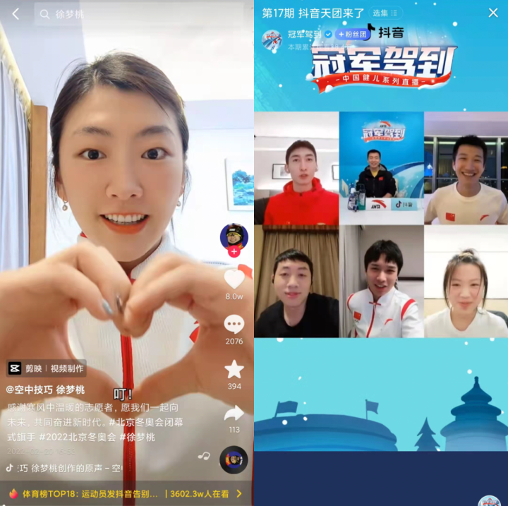 可以说,积攒了百余位冰雪健儿的入驻,让观众们有了「冠军天团就在抖音」的体验,也带来了多样的热点话题,赛事期间,入驻抖音的冰雪运动员总涨粉4075万。