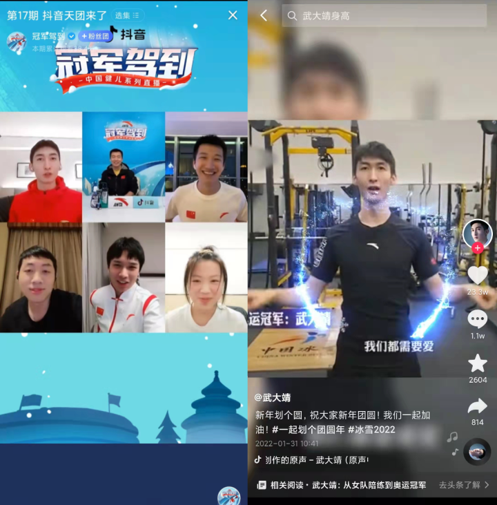 在抖音,这样的故事几乎每天都在发生。16天里,有超过100位冰雪运动员组成的「冠军天团」入驻抖音,不仅有武大靖、谷爱凌、徐梦桃、高亭宇、曲春雨等冠军运动员,还有张虹、周洋、福原爱和杨倩等焦点运动员。