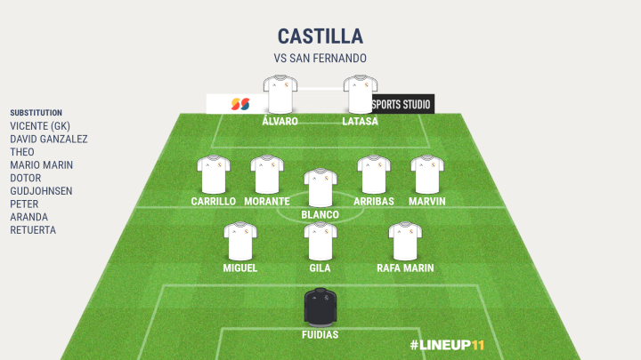 皇马卡斯蒂亚首发阵容(3-5-2):1-富伊迪亚斯(GK);16-拉法·马林、4-马里奥·希拉、3-米格尔·古铁雷斯;7-马尔温、10-阿里巴斯、6-安东尼奥·布兰科、14-伊万·莫兰特(65’ 11-彼得·冈萨雷斯)、15-卡里略(86’ 8-卡洛斯·多托尔);9-拉塔萨(65’ 22-苏维拉)、37-阿尔瓦罗·罗德里格斯(86’ 19-安德里·古德约翰森)