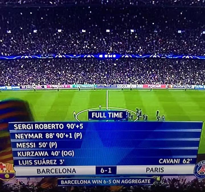 伤停补时第95分钟,内马尔任意球传入禁区,反越位成功的罗伯托小禁区前凌空垫射破门,6-1!巴萨在主场血洗对手,从而以6-5的总比分奇迹般地翻盘晋级八强。