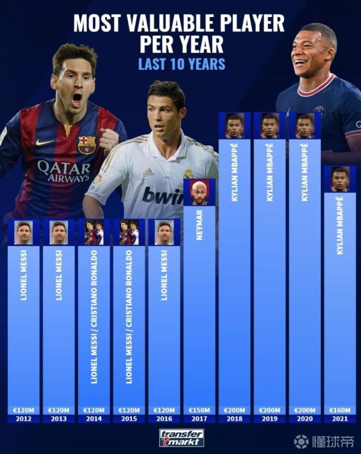 德国媒体“转会市场”统计了过去10年中每一年身价最高的球员:梅西5次上榜,姆巴佩4次上榜。
