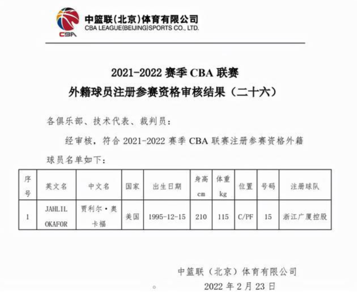 其实奥卡福加盟广厦男篮的消息已经传了很久,此前也有他来到中国的照片流出。昨天,CBA公司发出公告,透露广厦男篮已经给奥卡福完成了注册,这才算尘埃落定。