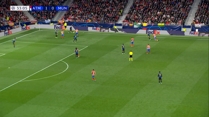 同样可以看出阵容框架的,在33:23,埃雷拉逆足精确斜长传找洛迪(集锦多半是从这个时间点开始的),但这一回合是于33:00开始的,曼联后场界外球掷出,马竞前场群小就地高位压迫,腿长的孔多比亚卡线(位置如下图所示)。曼联破高位压迫失败,马竞在中场线附近得球,曼联展开中低位压迫,但是被破解,埃雷拉领球转移,颇有克罗斯的感觉。