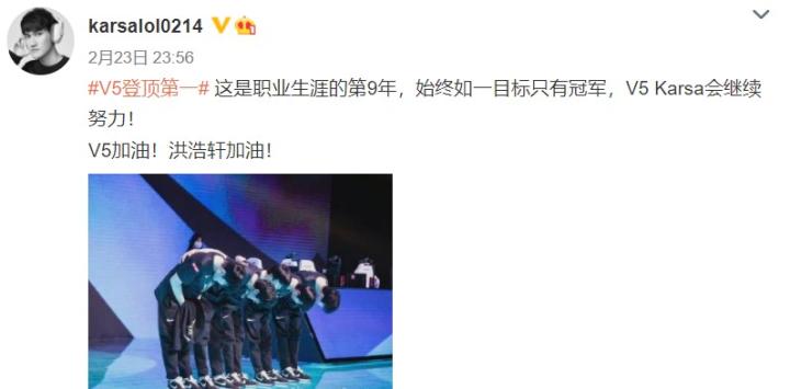 V5.Karsa开通微博:职业生涯的第9年,始终如一目标只有冠军 峡谷全视野 峡谷全视野2022-02-24 19:22昨晚英雄联盟LPL春季赛榜首之战,V5战胜EDG登顶第一。赛后V5打野Karsa开通微博:这是职业生涯的第9年,始终如一目标只有冠军,V5 Karsa会继续努力!V5加油!洪浩轩加油!前队友369评论玩梗“ok,ok”。展开更多