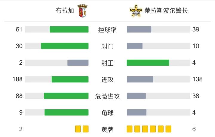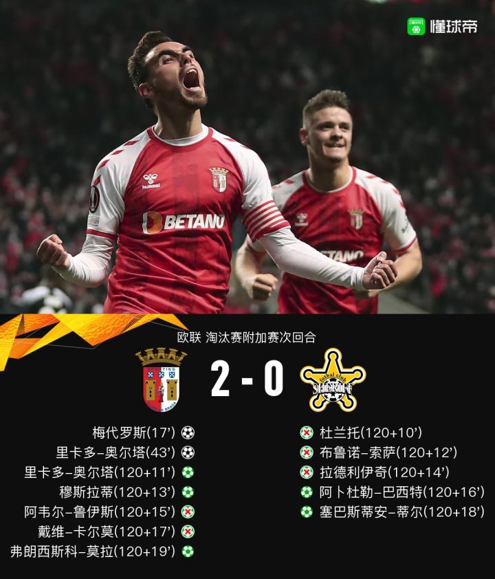 北京时间2月25日4:00,欧联淘汰赛附加赛次回合,布拉加主场对阵蒂拉斯波尔警长。上半场,安德烈-奥尔塔远射中柱,梅代罗斯推射破门,扬萨内单刀被扑出,里卡多-奥尔塔扩大比分。下半场,罗德里戈-戈麦斯远射被没收,阿韦尔-鲁伊斯推射打高,双方两回合2-2战平进入加时赛,加时赛中,阿韦尔-鲁伊斯、亚赫希博耶夫均错失良机。点球大战,杜兰托、布鲁诺-索萨、拉德利伊奇前三罚都没能打进,阿萨纳夏季斯两扑点,莫拉罚入制胜点球,最终,布拉加总比分5-4淘汰蒂拉斯波尔警长。