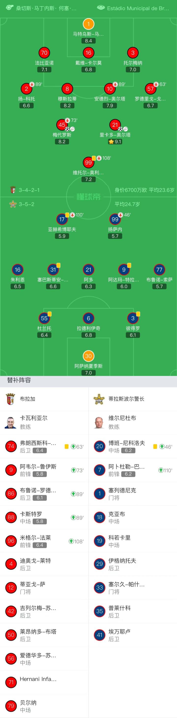 布拉加首发:1-马特乌斯-马加良斯、3-托尔梅纳、16-戴维-卡尔莫、70-法比亚诺、2-扬-科托、8-穆斯拉蒂、10-安德烈-奥尔塔、21-里卡多-奥尔塔、57-罗德里戈-戈麦斯、45-梅代罗斯、99-维托尔-奥利韦拉