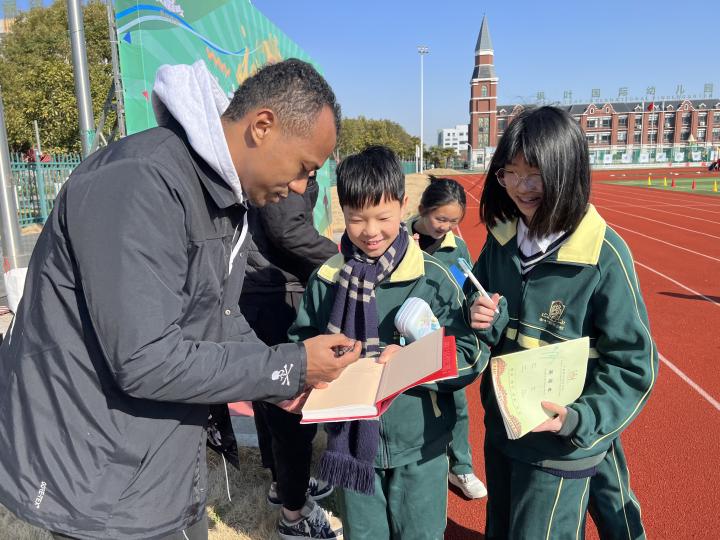 在签约仪式上,上海申花一线队球员秦升、艾迪与枫叶国际学校学生携手出场,并互赠纪念品。队员秦升在发言中鼓励同学们积极参加足球锻炼,祝福同学们学业有成、各有所长、全面发展。