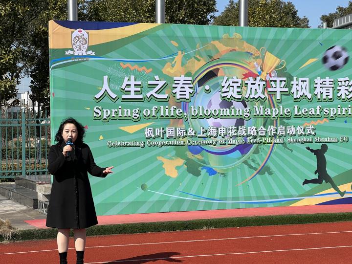 活动最后,枫叶教育集团长三角大区初中教学总监、上海枫叶国际学校初中校长、平湖枫叶国际学校校长董静为大家致辞:“很荣幸今天与拥有深厚底蕴的上海申花足球俱乐部签约,我衷心的希望我们平枫学子能够与申花小铭星青训携手,用汗水和意志去创造我们的人生之春,勇绽风采的光芒。今天平枫学子以枫叶为荣,明天枫叶集团以你们为傲!”