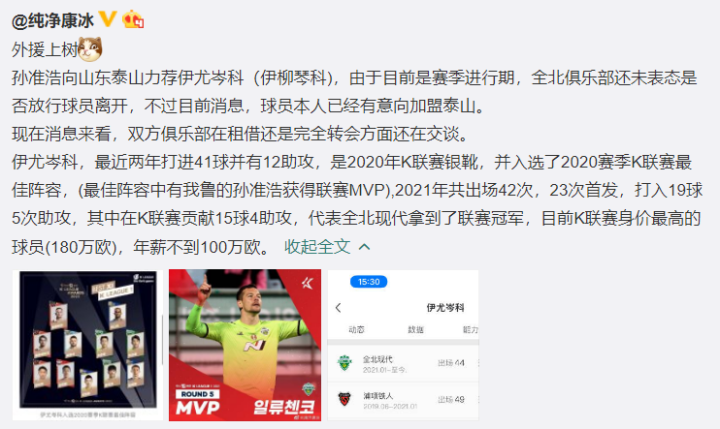 泰山晚报牛志明新赛季中超开赛时间和方案还在讨论当中,泰山队已经重新集中,为新赛季做准备。人员方面,泰山队24日宣布外援莱昂纳多租借加盟蔚山现代,现在泰山队还有5名外援有合同在身,不过莫伊塞斯的合同很快到期,泰山队还是有调整外援的空间。25日最新消息显示,泰山队正在接触全北现代外援伊尤琴科,孙准浩同样在劝说他加盟泰山队。