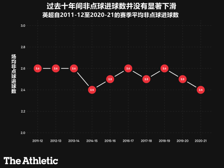 从2011-12赛季至2020-21赛季,英超场均非点球射门次数下降了17%,这跟同期的场均进球数变化趋势并不相符。英超上赛季的场均非点球进球为2.4粒,只是稍稍低于2011-12赛季的2.6粒,下降幅度并没有射门次数那么大。