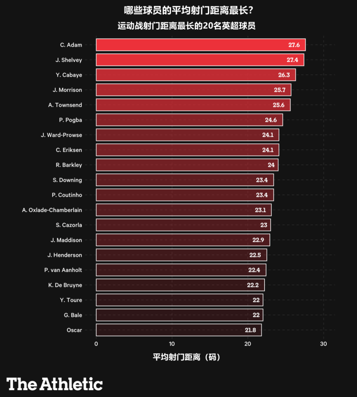 曾效力于利物浦和斯托克城的查理-亚当有着最长的平均运动战射门距离,达到27.6码,他82%的射门来自禁区外。亚当确实通过远射取得了6粒进球,但他并不以精准远射闻名。