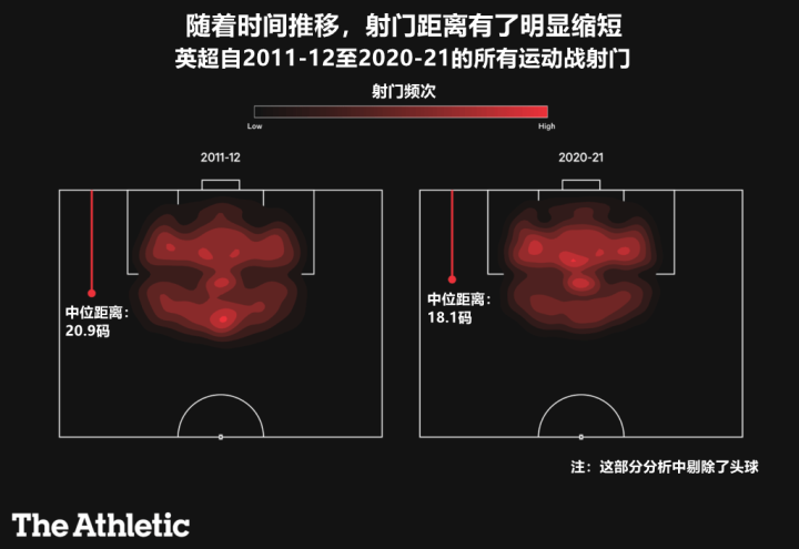 就和欧洲五大联赛的另外四个联赛一样,我们能看到英超球员的平均射门位置确实离球门更近了。中位距离,或者说平均距离在2020-21赛季为18.1码,而在2011-12赛季为20.9码。看上去似乎区别不大,但是想想与此相关的射门数量,还是能看到明显的变化趋势。