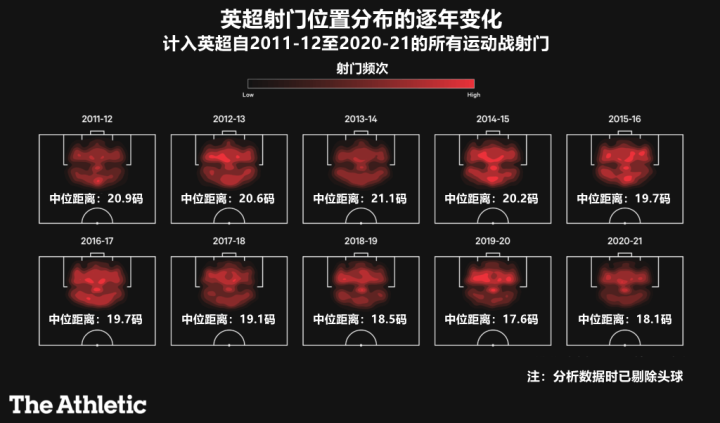 再次扩大视野,我们通过可视化数据来看看英超联赛前十个赛季里射门距离和位置分布是如何演变的。