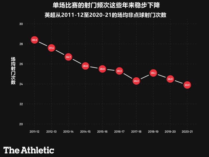 首先,咱们来看看英超近十年的射门次数是否有变化。如下图所示,场均射门次数确实在稳步下降。2011-12赛季的场均非点球射门次数为28.4次,上赛季则是23.9次,场均射门次数降低了将近5次。