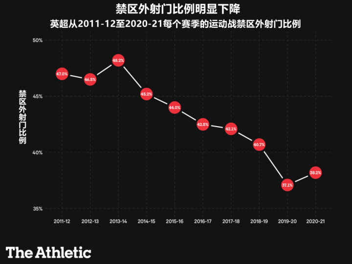 看上去是数据分析的影响以及训练中的辛勤工作抹掉了各支球队的低价值射门。如下图所示,运动战中禁区外远射的比例明显降低。十年前这一比例还高达47%,上赛季则是低得多的38%。