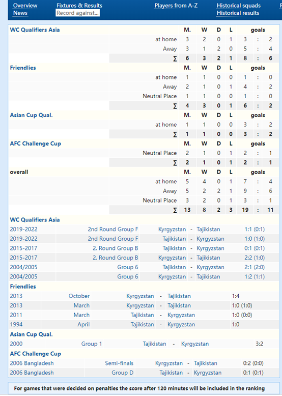 比如,两国的国家队曾13次交手,无论对于吉国还是塔国,这一数字都高于与其他国家队的交手次数。
