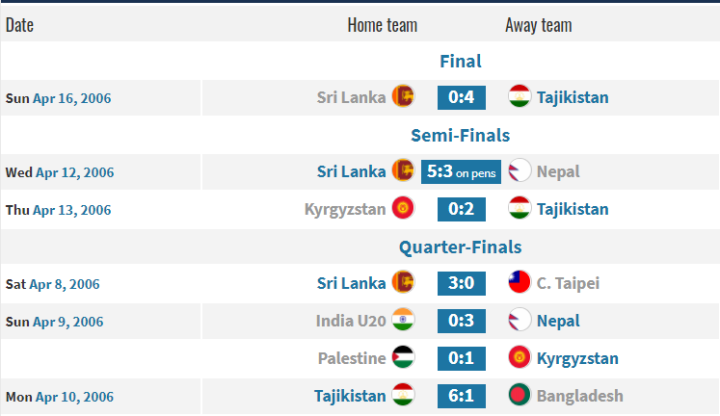 三十二强双双饮恨出局之后,两国又在2006年的挑战者杯抽到了同一组。这一次,吉尔吉斯斯坦终于硬气了一回——克拉斯诺夫的进球帮助球队1比0获胜,历史上第一次战胜塔吉克斯坦。然而冤家路窄,双方在半决赛再度碰面,这回塔吉克斯坦可不会再含糊了。前锋拉比耶夫梅开二度,塔吉克斯坦完胜对手进军决赛,并一举击溃斯里兰卡,勇夺挑战者杯冠军。拉比耶夫也成为了06年挑战者杯的金靴得主。