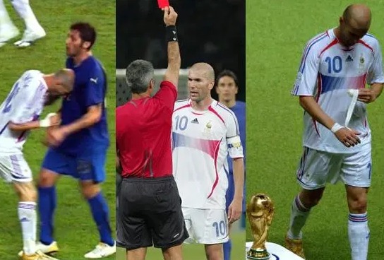 2006年7月9日,世界杯决赛,齐达内职业生涯谢幕演出,第110分钟,他被马特拉齐的口头挑衅激怒,用头将对方撞倒在地,被直接罚下。
