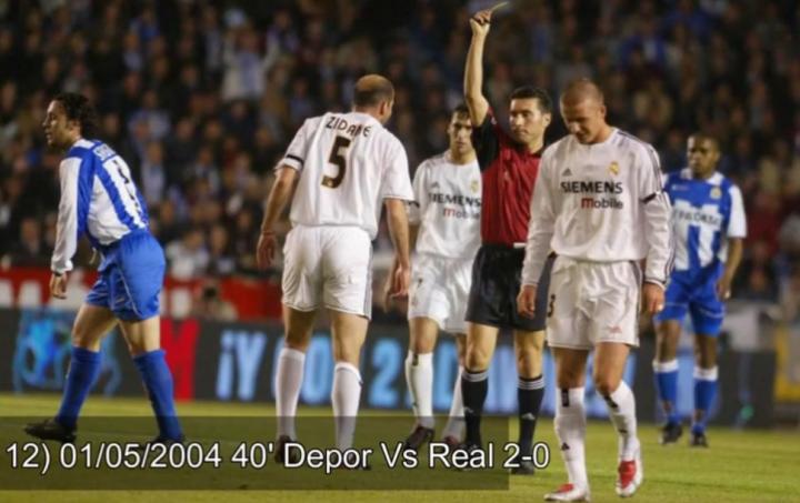 2004年5月1日,拉科鲁尼亚2比0战胜皇马。第42分钟,齐达内从背后铲倒德贾明哈,累积两张黄牌被罚下场。
