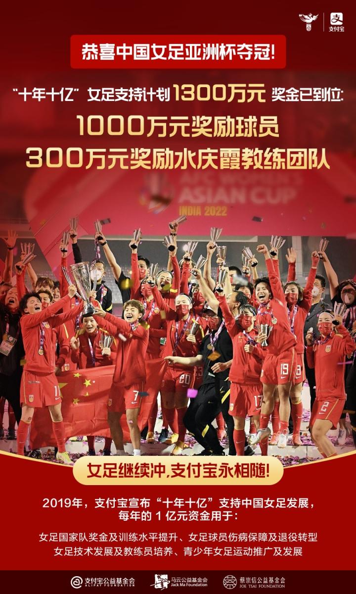 在夺冠的当天晚上,作为中国之队合作伙伴的蒙牛率先给出了1000万元的现金奖励,而后中国女足公益支持伙伴支付宝则拿出总计1300万元的奖金。