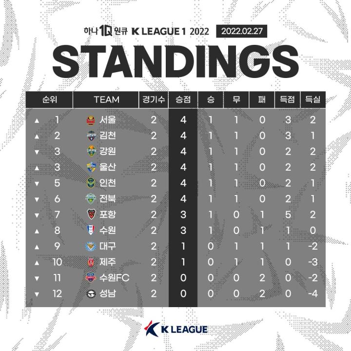 2月27日,K联赛又进行了两场比赛的争夺。在首先进行的金泉尚武和浦项铁人的比赛中,金泉尚武成功拿到了加入K1联赛的历史首胜,曹圭成、徐进水、郑铉澈分别为尚武建功,而浦项方面由帕拉西奥斯和许榕埈完成破门,值得一提的是,许榕埈连续两轮取得进球,他也以3球位居射手榜榜首。而另一场焦点战在两支赛季夺冠热门中展开,首轮主场告负的大邱FC虽然先失一球,但凭借中场高在贤禁区内的灵光一现,1-1逼平了卫冕冠军全北现代汽车。全北主帅金相植连续两个赛季,联赛次轮遭遇对手强势阻击。对于他来说,今年的日子又不会好过。