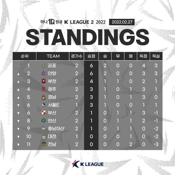 本轮战罢后,两连胜的金浦、安养位居前两位,富川则是成为第三支前两轮出战保持不败的球队,拿到了4个积分。而上赛季的联赛第四全南天龙,则是赛季遭遇开局两连败。对于本赛季三线作战的他们来说,这是一个很大的打击,他们需要重新振作。