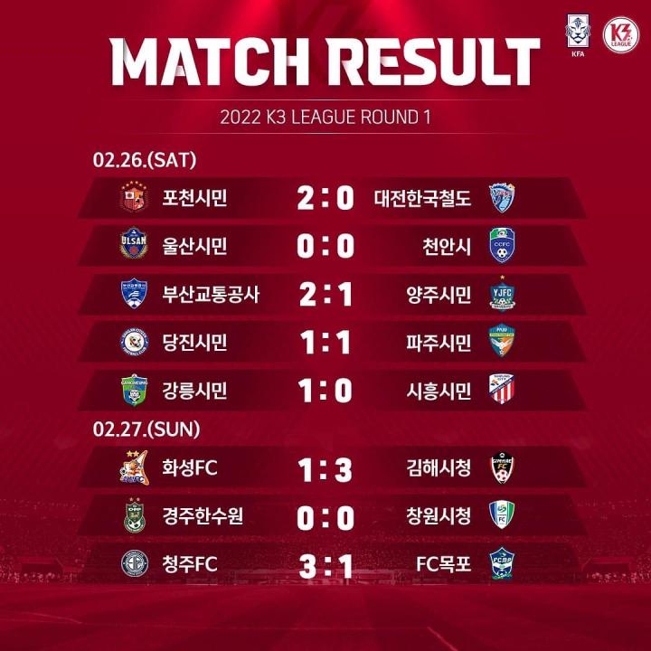 本周末,韩国的K3和K4联赛也开始了新赛季的首轮争夺,16支球队展开了首轮争夺。首轮焦点战在天安市民和蔚山市民之间展开。志在夺冠的天安市民队请来了韩国足坛名宿金泰映,要在赛季结束后通过夺冠转为职业队升到K2联赛,通过招兵买马,天安市民召集了一批在K联赛有多年经验的球员征战联赛,在首轮比赛中,他们与蔚山市民展开激战,但最终却无法敲开对手球门,0-0和对手握手言和。对于天安市民来说,他们只能期待3月5日再拿到赛季首胜了。算上这场比赛,首轮八战还有2场平局,其余五场全部分出了胜负。首轮战罢,金海市厅位居榜首领跑。