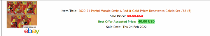 目前ebay上成交记录只有帕尼尼马赛克红金折88编的约尼查有成交记录,5张贝内文托套卡总计260人民币,稍微有丁点价,买主估计是贝内文托球迷。既然马赛克出了他的88编,那可能也有ofo,任何球员就算冷门球员的ofo都有希望拍得高价。我猜测马赛克ofo是约尼查唯一一版ofo,也是最后一版ofo,毕竟约尼查年龄已经31岁,而且目前身居意乙,不可能再次登上新赛季的帕尼尼球星卡。如果喜欢的球迷可以收一收他的低编,价格不高,如果出于转手目的,没有任何必要。