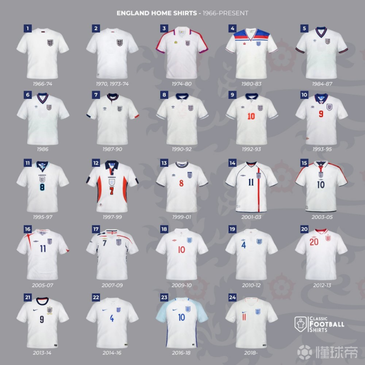 罗列了英格兰国家队队历代的球衣设计,哪一件你印象...