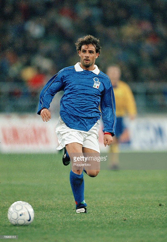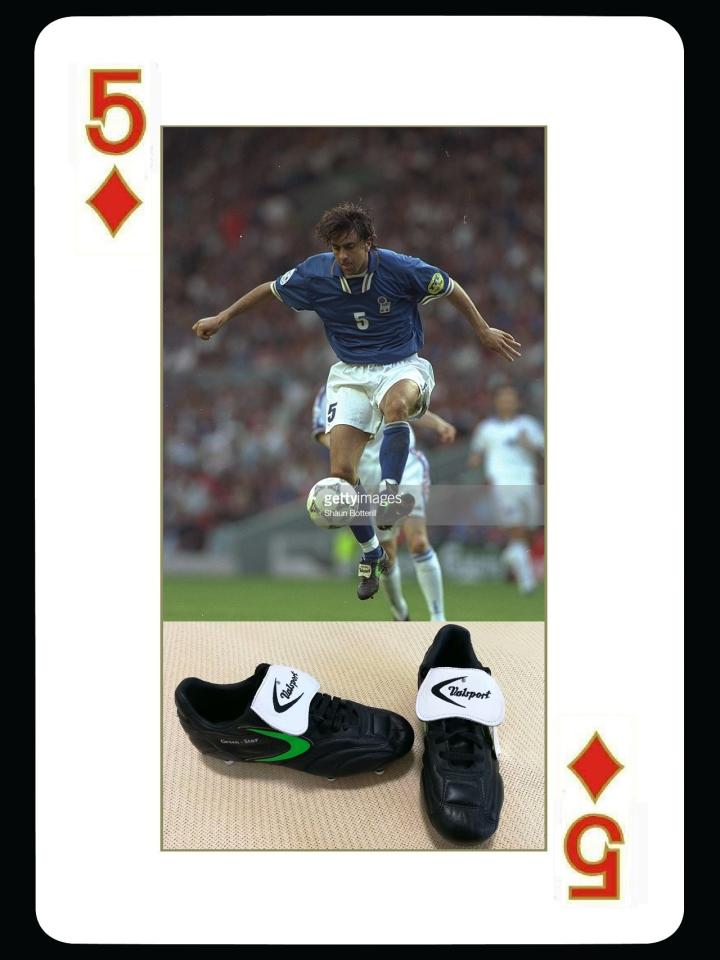 另一位米兰元老塔索蒂当年也是valsport的代言球员,不过由于他年龄比较大,所以代言的时间不算长,塔索蒂出道于拉齐奥,却在米兰最困难的时期加盟球队,因此成为了米兰涅槃重生的基石。虽然在米兰取得了无数荣誉,但直到32岁才首次入选意大利队,1994年欧冠决赛,由于巴雷西受伤,塔索蒂作为队长出战,带领米兰4比0横扫巴萨夺冠。34岁终于有机会参加1994年世界杯,他防守凶悍老道,当年恩里克就在世界杯上被他一肘子打断了鼻梁骨,还没吃红牌。 不过随后被国际足联禁赛七场,他的意大利国家生涯也就此终结,塔索蒂当时穿的是valsport的Goledor黑白色球鞋。1997年,37岁的塔索蒂退役,此后一直在米兰俱乐部担任助理教练。