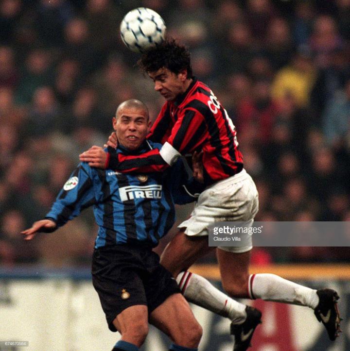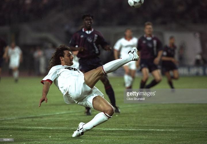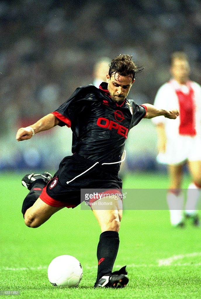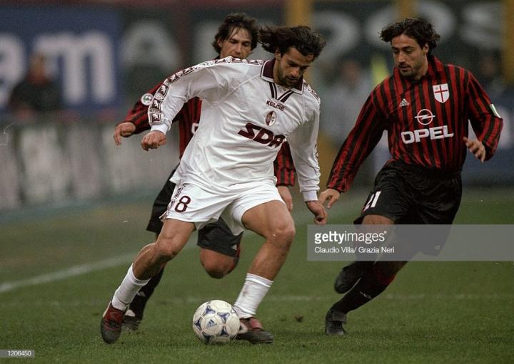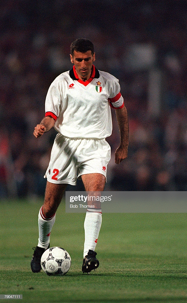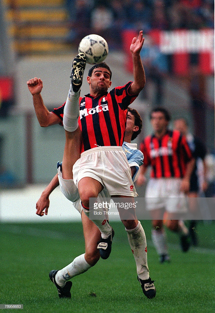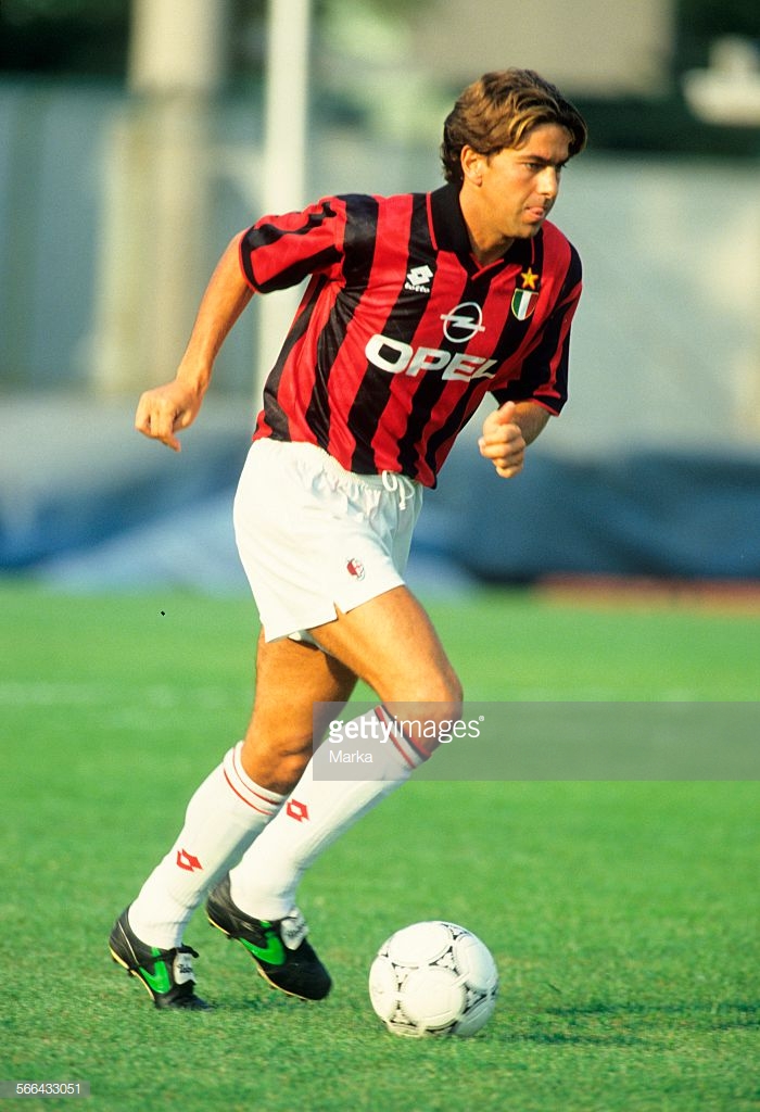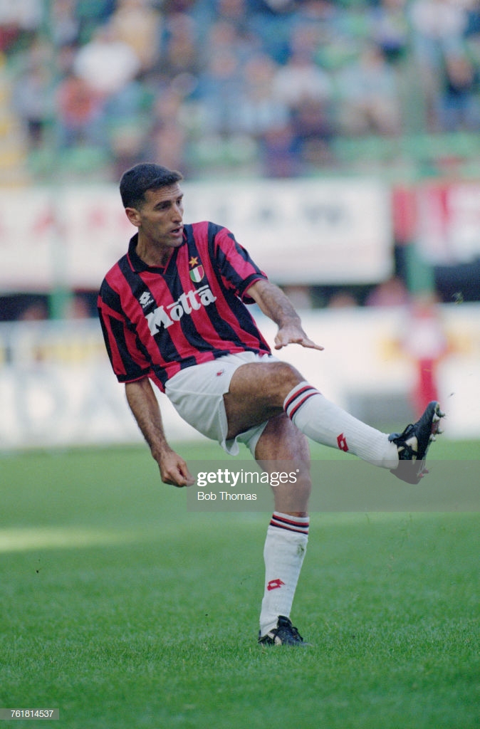我们最熟悉的是科斯塔库塔,老比利作为米兰元老,也是使用valsport球鞋时间最长的球员,1992年他就已经开始穿回旋镖logo球鞋,他使用较多的是绿色logo的green star。科斯塔库塔身材不算高大,但擅长盯人补位,和巴雷西搭档默契,是米兰王朝的后防四将之一,长相还算帅气的科斯塔库塔当年也是valsport的主要代言球星。在萨基成为意大利队主教练后,科斯塔库塔也成为了意大利国家队的成员,参加了1994年世界杯。不过在之后的丰田杯他的表现堪称灾难级,让萨斯菲尔德一战成名。科斯塔库塔是米兰队中的常青树,参加了96年欧洲杯和98年世界杯,他和valsport的合同可能持续了十年左右,在2002年才换了lotto的赞助。他还在新世纪代表米兰获得了两次欧冠冠军,直到2007年41岁才退役。