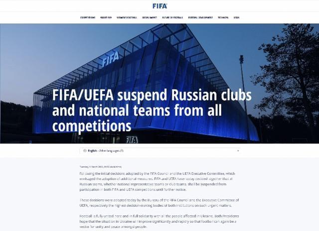 国际足联公告称:“国际足联与欧足联决定,所有俄罗斯队伍,包括国家队与俱乐部球队将被禁止参加国际足联与欧足联旗下的比赛,直到另行通知为止。国际足联理事会主席团和欧足联执行委员会今天通过了这些决定,这两个机构是在此类紧急事项上的最高决策机构。”