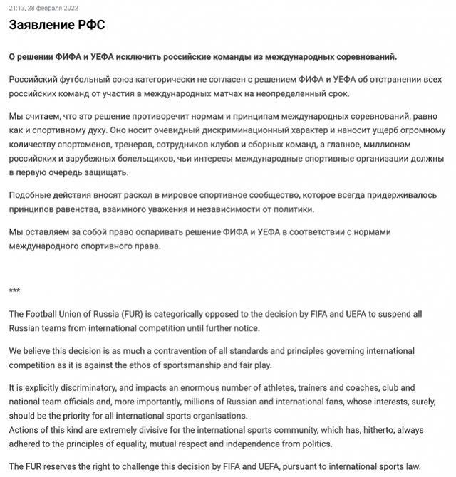俄罗斯足协官方通告回应称:“关于国际足联和欧足联对俄罗斯球队国际禁赛的决定,俄罗斯足协坚决不同意。我们认为这一决定违背了国际体育赛事的规范和原则,也违背了体育精神。它具有明显的歧视性,伤害了无数的运动员、教练、俱乐部和国家队的雇员,最重要的是数百万俄罗斯和外国球迷,他们的利益是国际体育组织必须首先保护的。这种行为正在分裂国际体育界,国际体育界一直坚持平等、相互尊重和独立于政治的原则。”