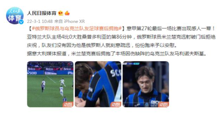 在意甲第27轮最后一场比赛中,亚特兰大队主场4比0大胜桑普多利亚的第86分钟,俄罗斯球员米兰楚克远射破门后拒绝庆祝,队友们没有因为他是俄罗斯人就刻意疏远,纷纷跑来予以安慰。